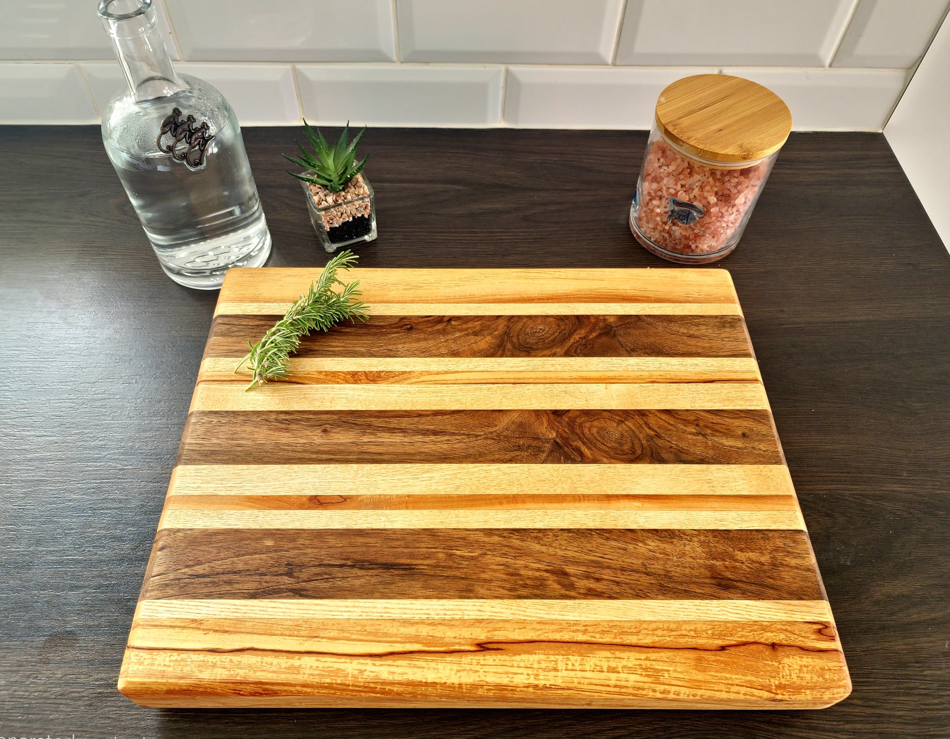 This Walnut-Cherry-Maple edge grain board combines the rich tones of walnut, the warm hues of cherry, and the light shades of maple. Its sturdy edge grain construction ensures durability and a smooth surface, making it ideal for chopping, serving, or kitchen display. A practical and attractive addition to any kitchen.