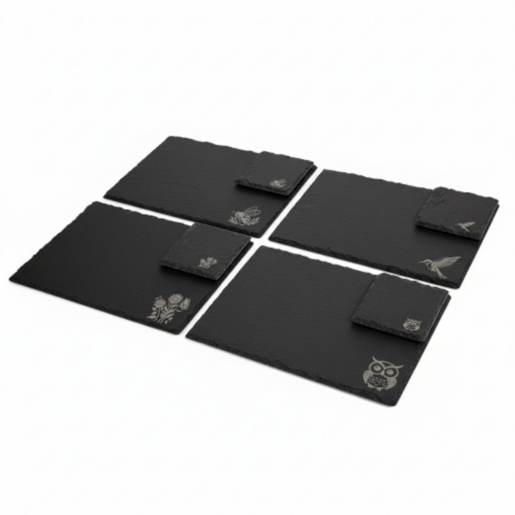This slate dining set combines natural beauty with elegant engraved details. Durable and stylish, each piece is designed to enhance your table setting while standing up to everyday use. The engraved patterns add a distinctive touch that works with any décor. A practical choice for those who value quality and character in their dining essentials.